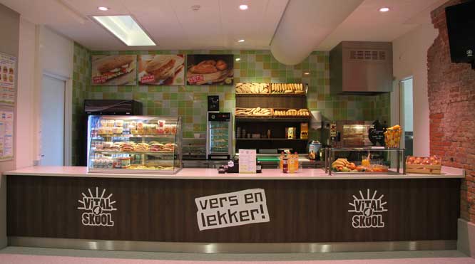 Maar waarom is het kiezen voor een gezonde schoolkantine dan zo van belang? “Een kantine runnen is geen kernactiviteit van een school, maar in steeds meer belangrijkere mate behoort het bieden van verantwoorde, lekkere voeding wel tot de kerntaak. Ook wij vinden dit als school belangrijk. Dan moet je ervoor kiezen om gedegen en betrouwbare expertise van buiten naar binnen te halen. De tijd van smoezelige counters waar de conciërge voorverpakte en ongezonde producten verkoopt, kan echt niet meer! De nieuwe locatie is vormgegeven conform de actuele huisstijl van Vital4Skool. Als school realiseren we hiermee een bijzondere, gezonde schoolkantine met veel aandacht voor versbeleving, sfeer en routing. Een ontmoetingsruimte waarin de gast centraal staat en kan genieten van lekker eten.”